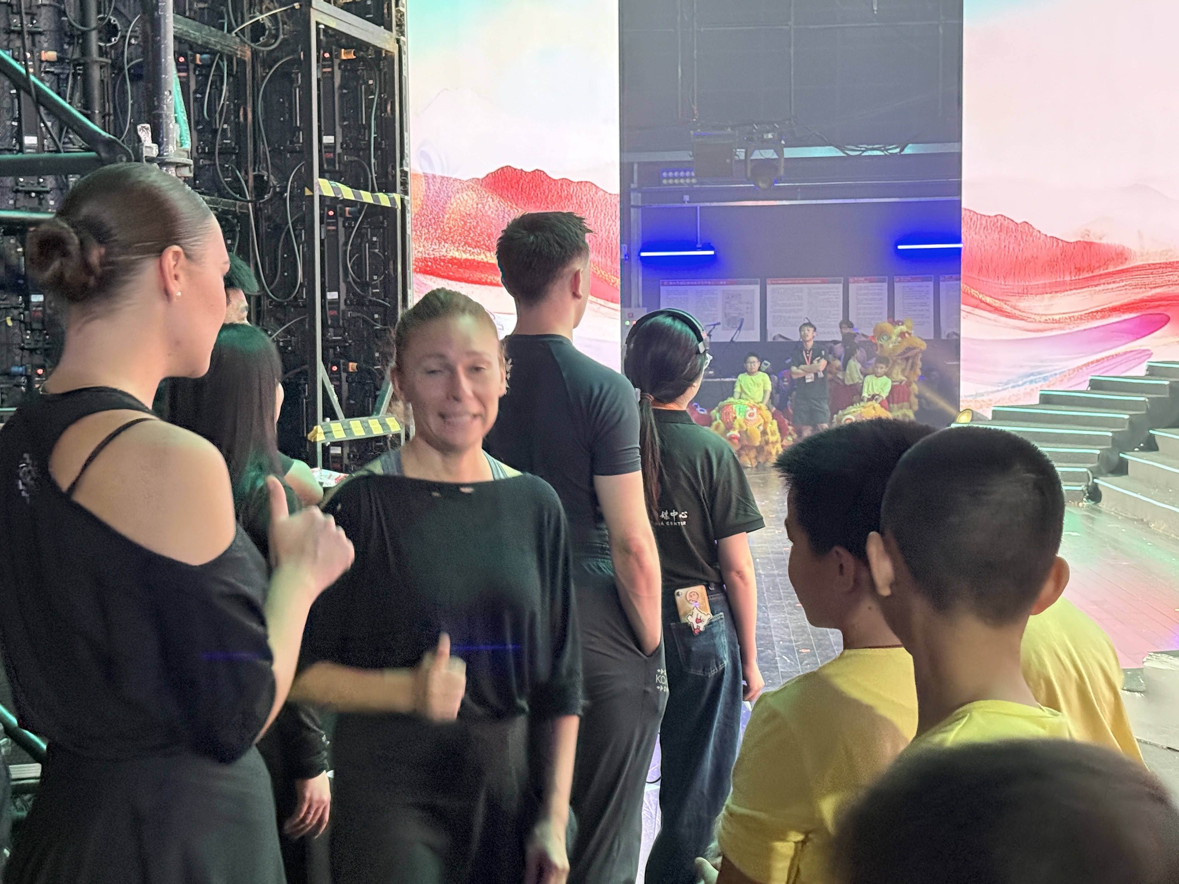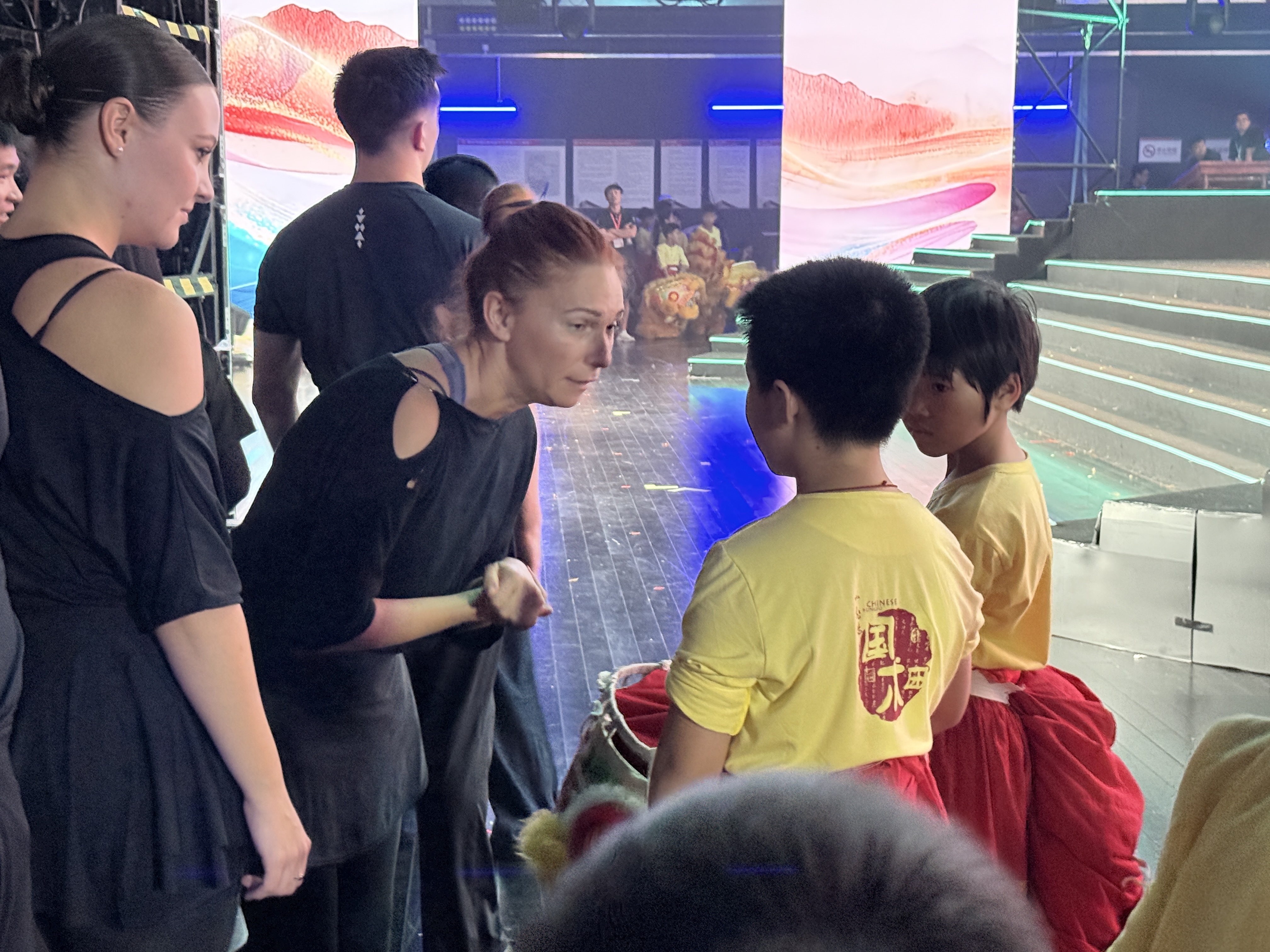 塞尔维亚科洛民族歌舞团的演员俯下身,与佛山南海西樵民乐小学的舞狮小演员视线齐平,用略带口音的中文轻声问候:“你,几岁?”“8岁!”童音清脆落下的刹那,一个大拇指已高高竖起,笑容在两人眼底交汇流转。