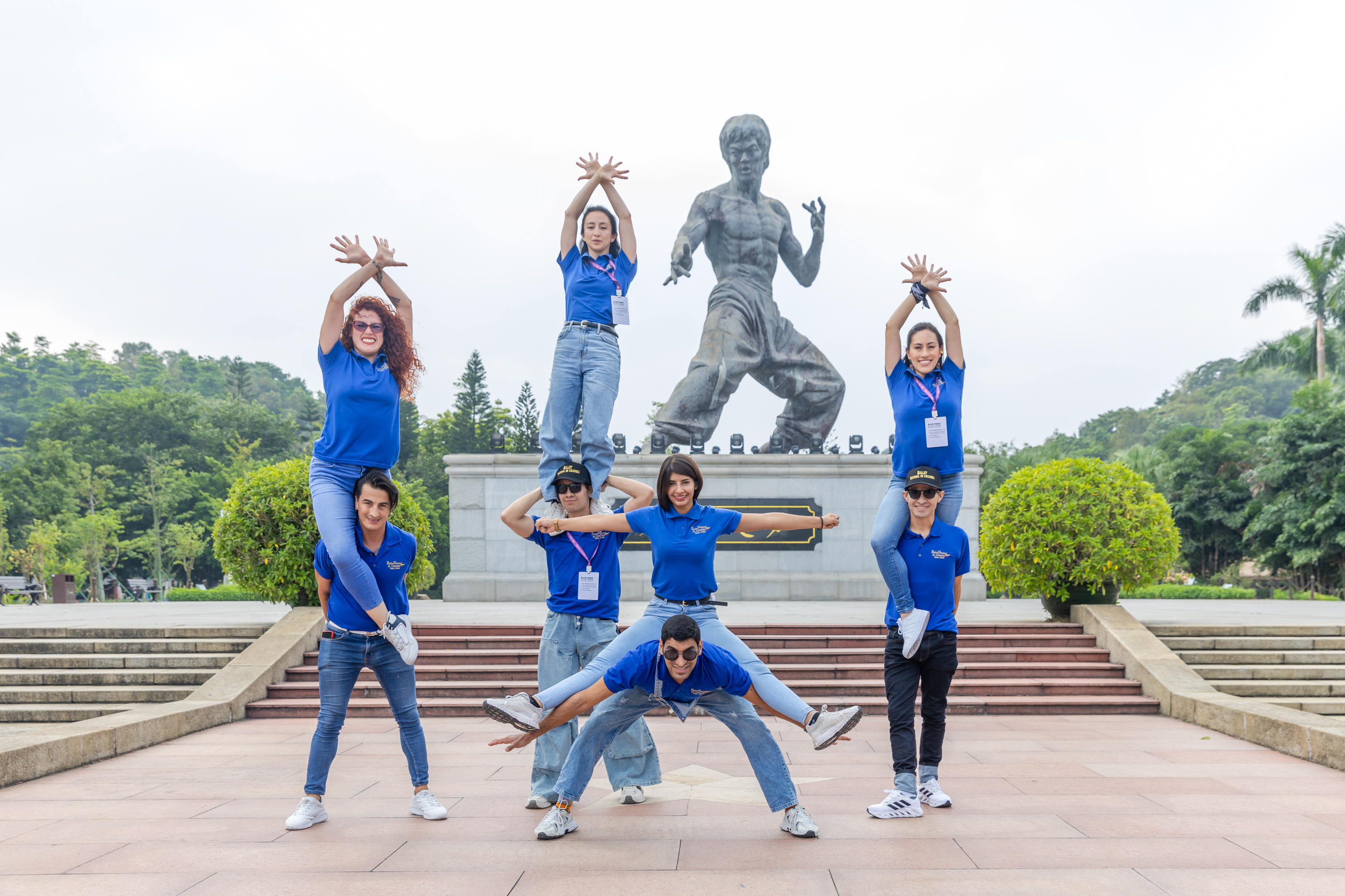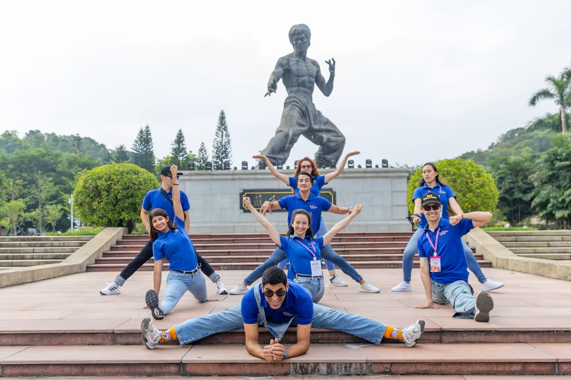 园区内18.8 米高的李小龙石雕像吸引了所有人的目光,艺术团成员们纷纷摆出经典功夫 Pose 合影,现场瞬间变身 “功夫秀场”。除了了解佛山的功夫文化,现场还开设了精彩多样的非遗展示区,浓郁的岭南文化气息扑面而来:粤剧体验区里,外国友人认真跟着艺人学习唱腔身段,戴上精致头冠、穿上华丽戏服的模样引得众人欢笑;武术教头一招一式地传授基础拳法,学员们学得有板有眼,刚劲有力的动作赢得阵阵掌声;马岗雕版印刷体验区,大家亲手拓印图案,捧着自己的作品爱不释手。